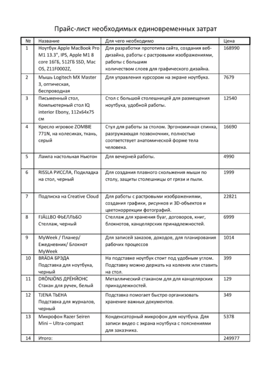 2. Мой бизнес-план, смету, скриншоты и прайс-лист товаров +